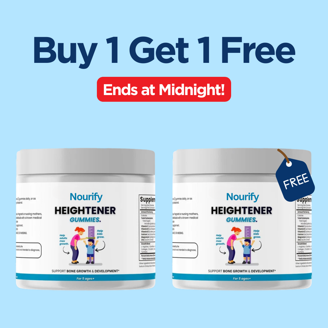 Las gomitas Nourify Heightener son un suplemento dietético formulado por médicos, diseñado para favorecer el crecimiento natural en altura, la fortaleza ósea, la postura y el bienestar general. Contienen una potente mezcla de vitaminas, minerales y aminoácidos, como calcio, vitamina D3, zinc, magnesio y L-arginina, para ayudar a que tu hijo o adolescente alcance su máximo potencial de crecimiento.